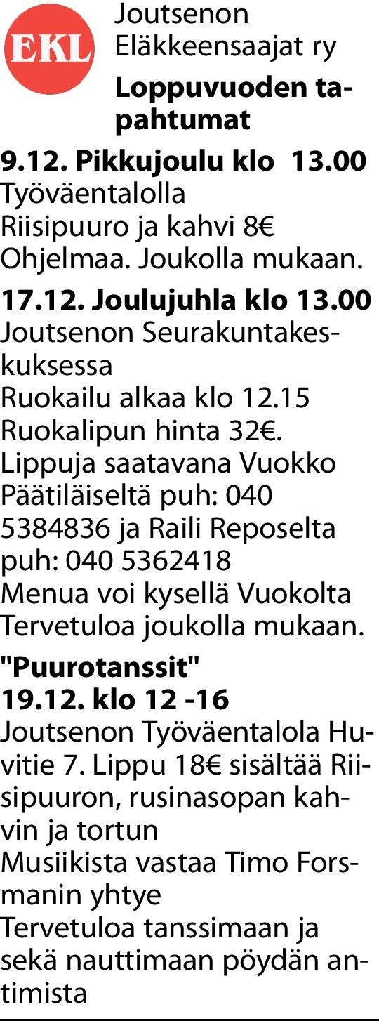 Olemme Joutsenon alueella aktiivisesti toimiva eläkeläisyhdistys. Toimintamme pohjautuu Joutsenon alueen eläkeläisten edunvalvontaan ja yhteistyön kehittämiseen. Haluamme sivuillamme tiedoittaa lukijoillemme toiminnastamme ja sen historiasta. Jos tunnet kiinnostusta toimintaamme kohtaan ota yhteyttä. Sivuiltamme löydät yhteystietomme.