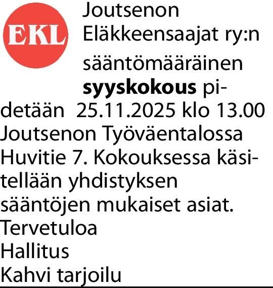 Olemme Joutsenon alueella aktiivisesti toimiva eläkeläisyhdistys. Toimintamme pohjautuu Joutsenon alueen eläkeläisten edunvalvontaan ja yhteistyön kehittämiseen. Haluamme sivuillamme tiedoittaa lukijoillemme toiminnastamme ja sen historiasta. Jos tunnet kiinnostusta toimintaamme kohtaan ota yhteyttä. Sivuiltamme löydät yhteystietomme.